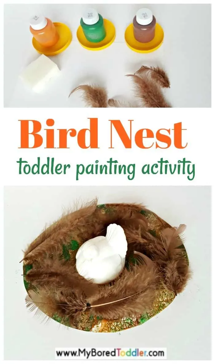 A bird nest is fun to add to your spring painting activities. This bird nest combines feathers and a painting activity for sensory and fine motor play. Toddlers will love putting a little bird figure or plastic eggs in the nest.