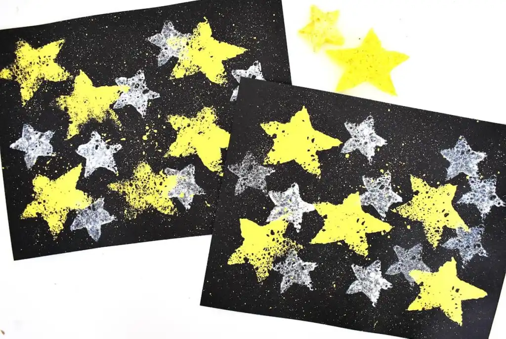 Cut a regular sponge into a star shape (see instructions HERE) and use them as stamps on black card. You can also use star shaped cookie cutters too.
