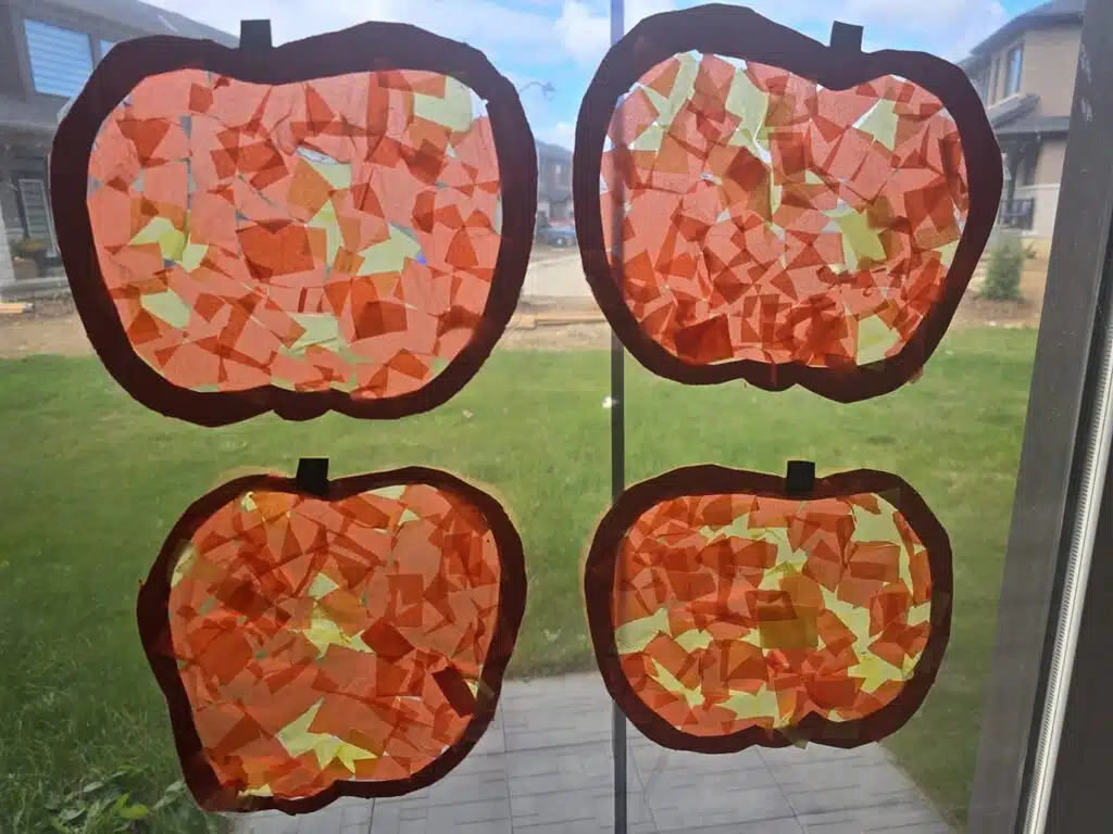 Cut out a cardboard pumpkin outline. Place sticky back paper over it and then use small pieces of orange cellophane to create a fun sun catcher pumpkin!