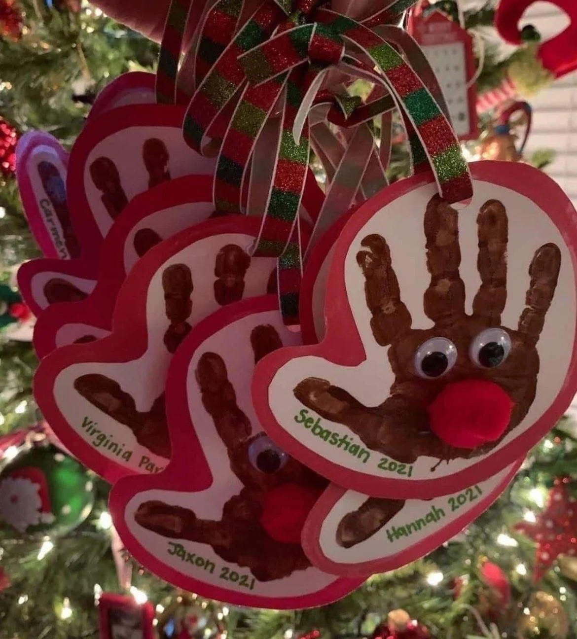 To make these place a handprint onto white paper. Cut it out and add it to red or green cardstock and then laminate. Add the googly eys and a pom pom for the nose. Punch a hole at the top and add some ribbon.