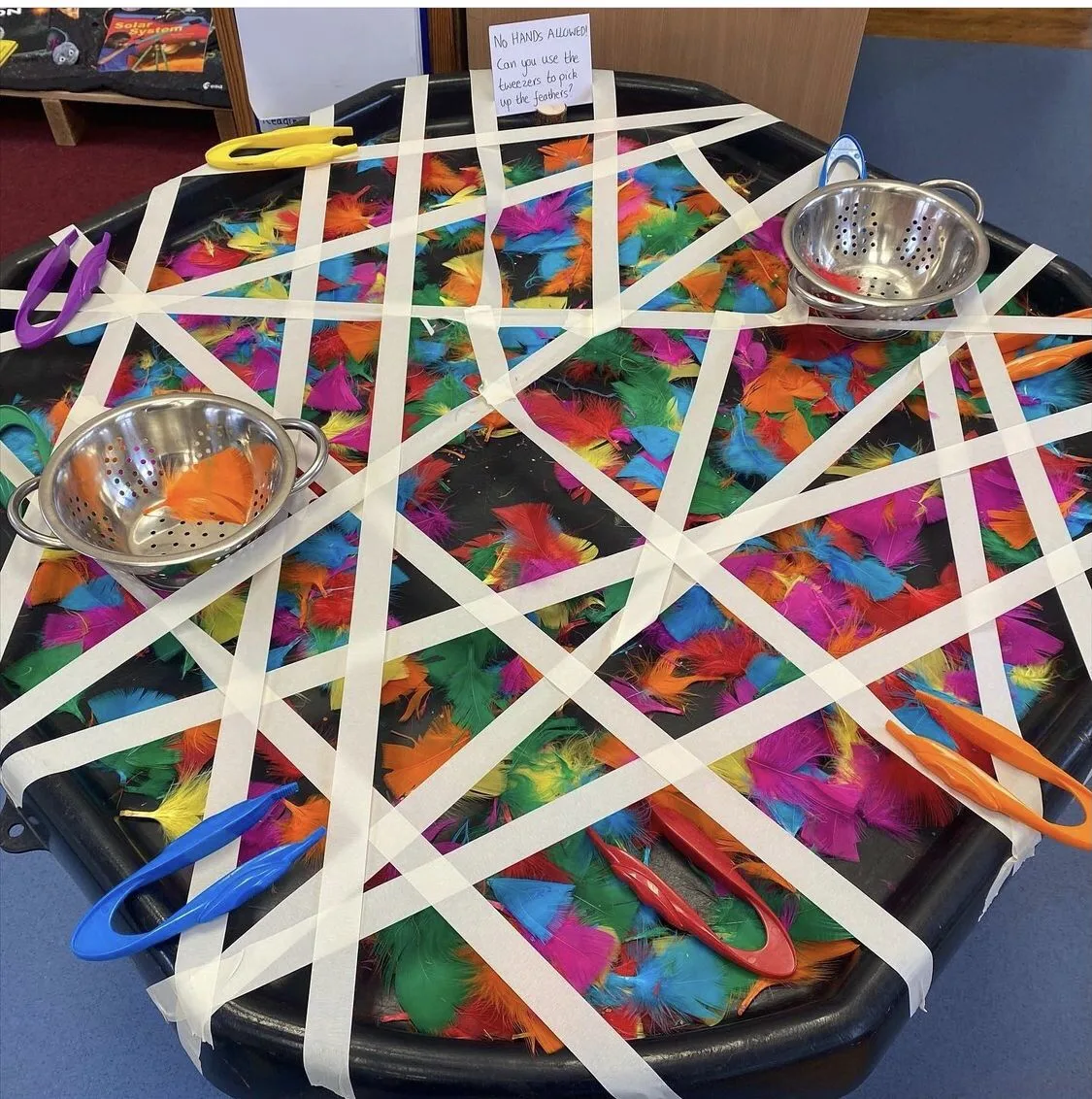 You don't need to make yours as big as this, but this is a great fine motor activity. Place mixed feathers on a tray (you can buy craft feathers like these HERE), cover with masking tape and use tweezers or tongs to 'rescue' them. I always love to recommend THIS Fine Motor pack which includes a great set of toddler friendly tweezers.